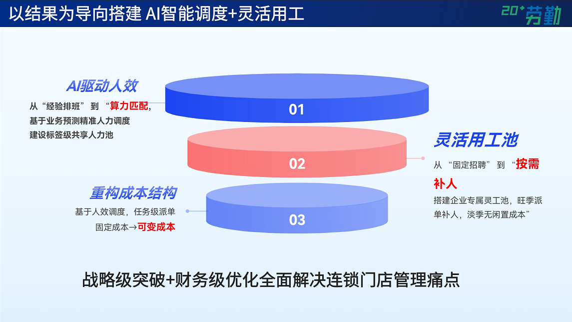 劳勤AI 驱动智能调度与灵活用工解决方案以结果为导向,从人效、用工、成本三个层面,战略级突破+财务级优化全面解决连锁门店管理痛点。